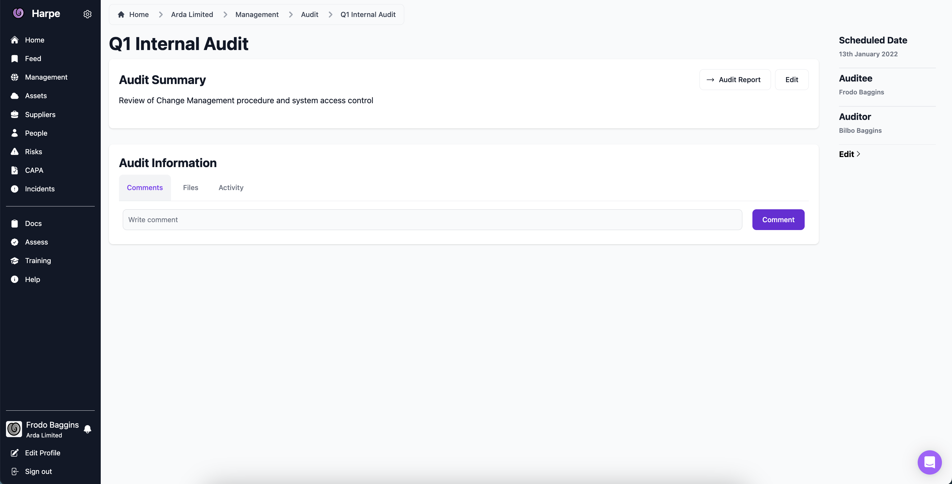 Clicking on an audit in the table will take you to an expanded view of the item. Here you can edit fields, leave comments, upload relevant files, and view any activity on the page.