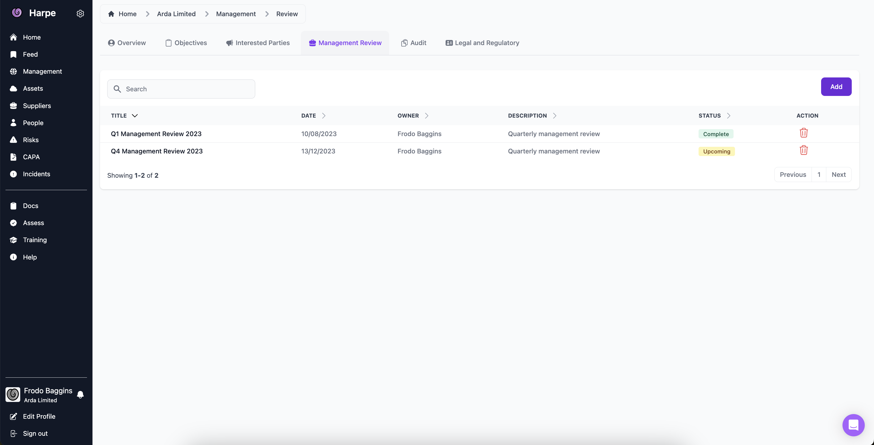 This page will display all your previous and currently planned management reviews. You can plan more reviews or add previously conducted reviews by clicking the `Add` button, or view more details about your added management reviews by clicking on them in the list.