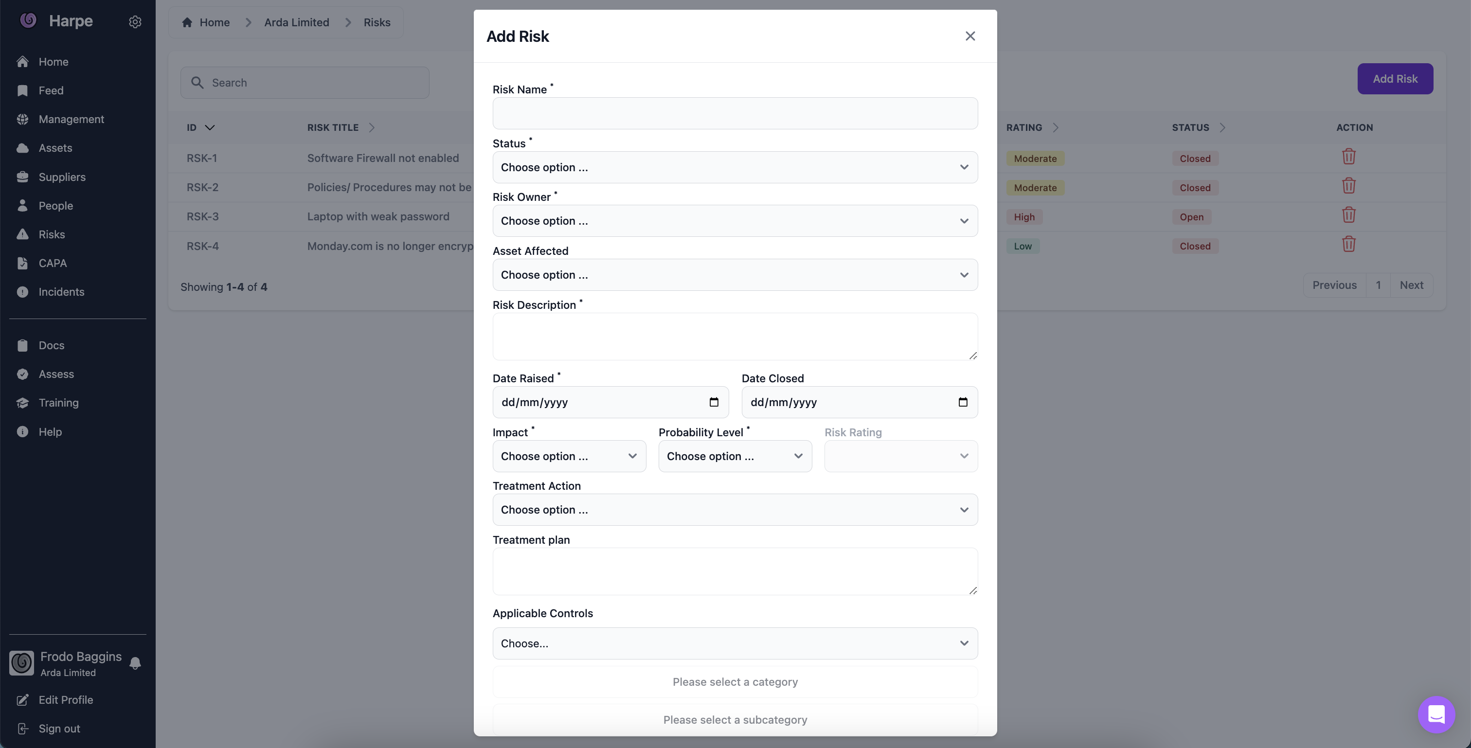 <figure><img src="https://926412512-files.gitbook.io/~/files/v0/b/gitbook-x-prod.appspot.com/o/spaces%2FLDL9UgG3eLCDTi27vU88%2Fuploads%2Flh7ZUy7DhE7DWf9ltJFZ%2Frisks%20-%20add%20form.png?alt=media&#x26;token=0dba6cc4-83c0-4a6f-9ba8-812bc11e4236" alt=""><figcaption><p>Add Risk form</p></figcaption></figure>